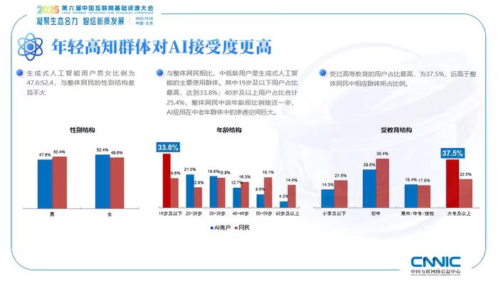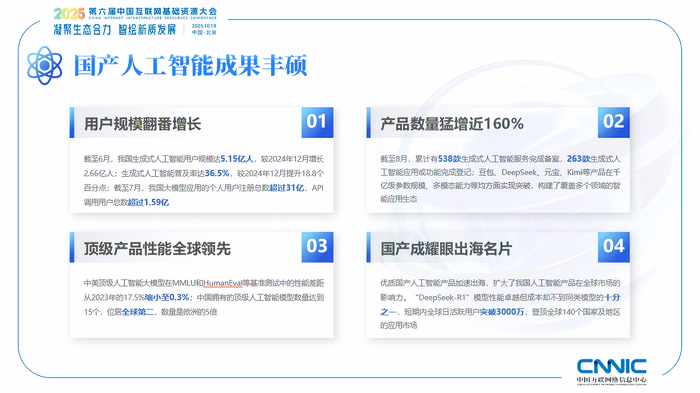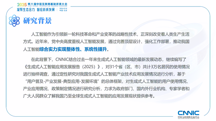 10月18日,中国互联网络信息中心(CNNIC)在2025(第六届)中国互联网基础资源大会上发布《生成式人工智能应用发展报告(2025)》(以下简称《报告》)。中国互联网络信息中心副主任张晓对《报告》进行了发布与解读。